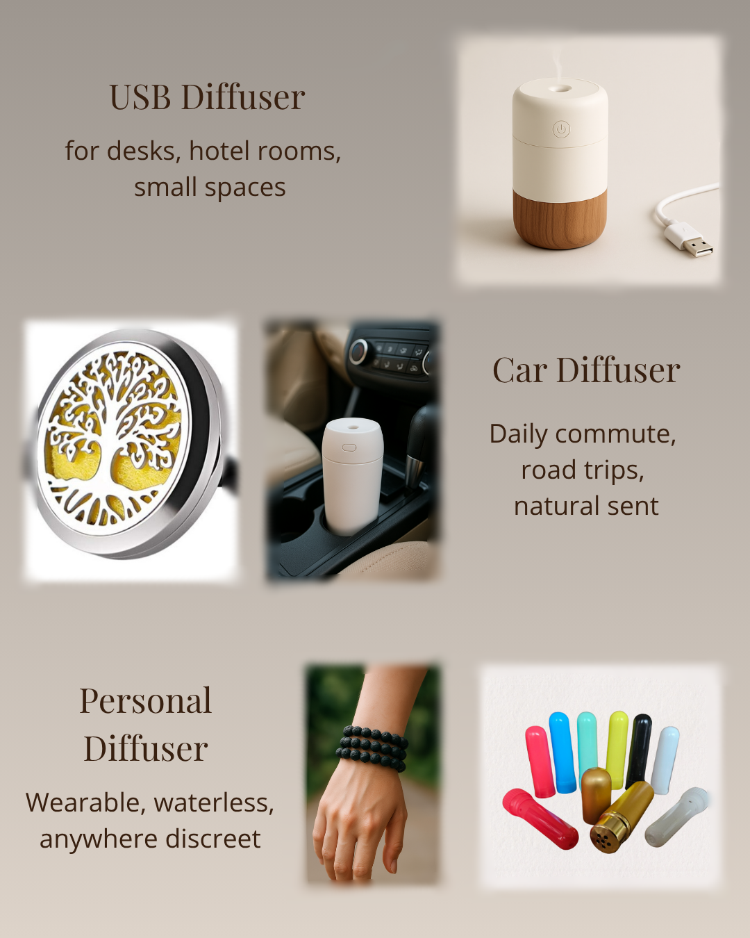 From misting USB diffusers to simple wearable options, portable diffusers allow anyone to enjoy essential oils beyond the home. There’s truly something for every situation—whether you're looking to relax on the road, focus at work, or stay calm in busy environments.