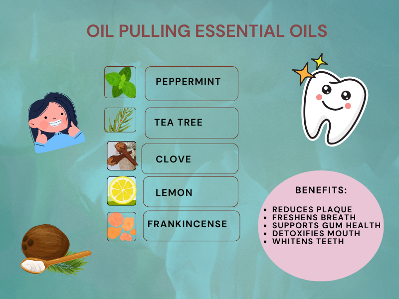 - Benefits: Peppermint oil fights bacteria that cause bad breath and creates a refreshing sensation while oil pulling.
